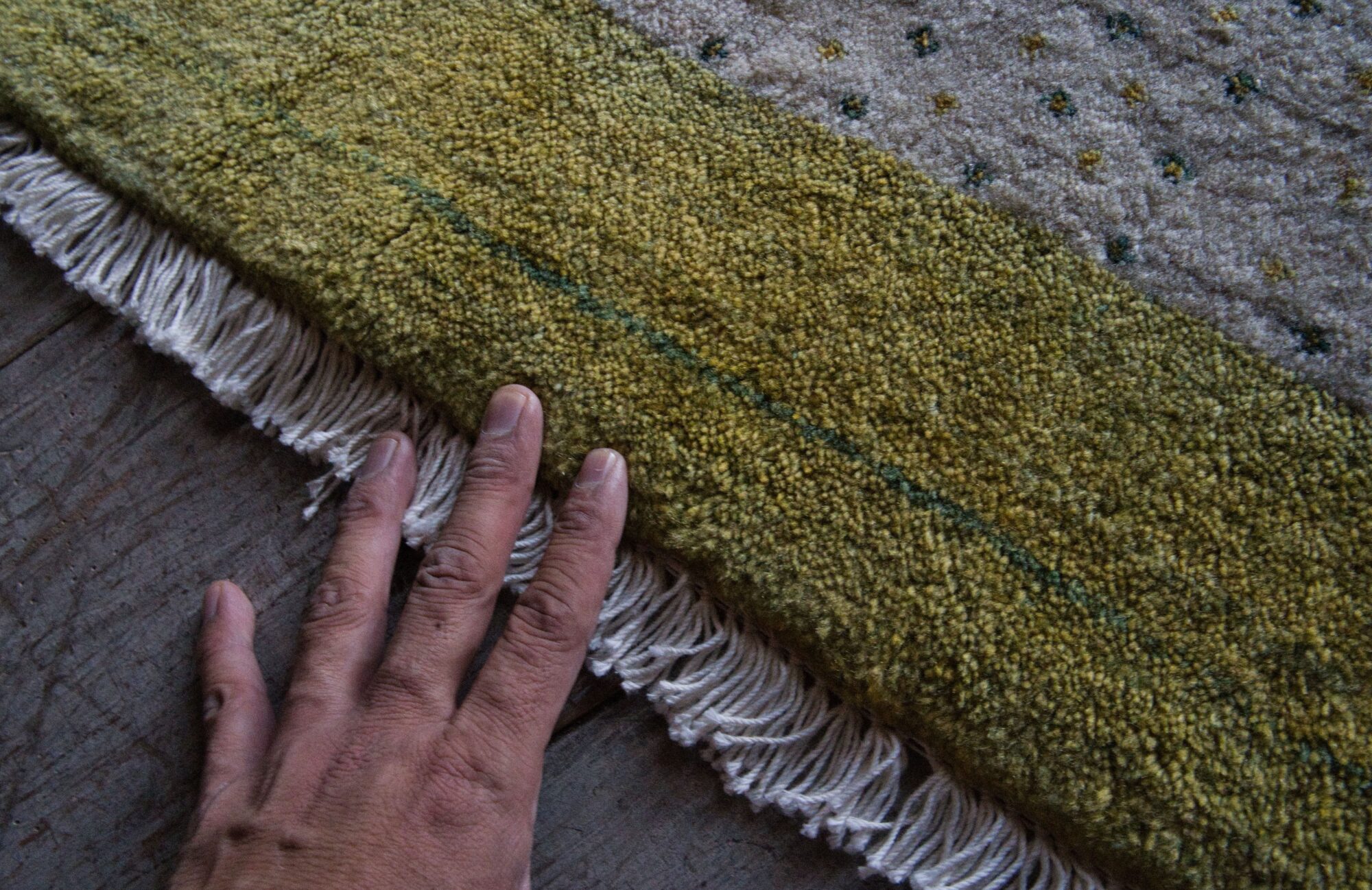 厚すぎず家具にも馴染みやすい織りで、リビングや寝室、ワークスペースのアクセントとしてもおすすめです。暮らしに穏やかな空気と自然素材の温もりを添える、一点物の特別なギャッベ。