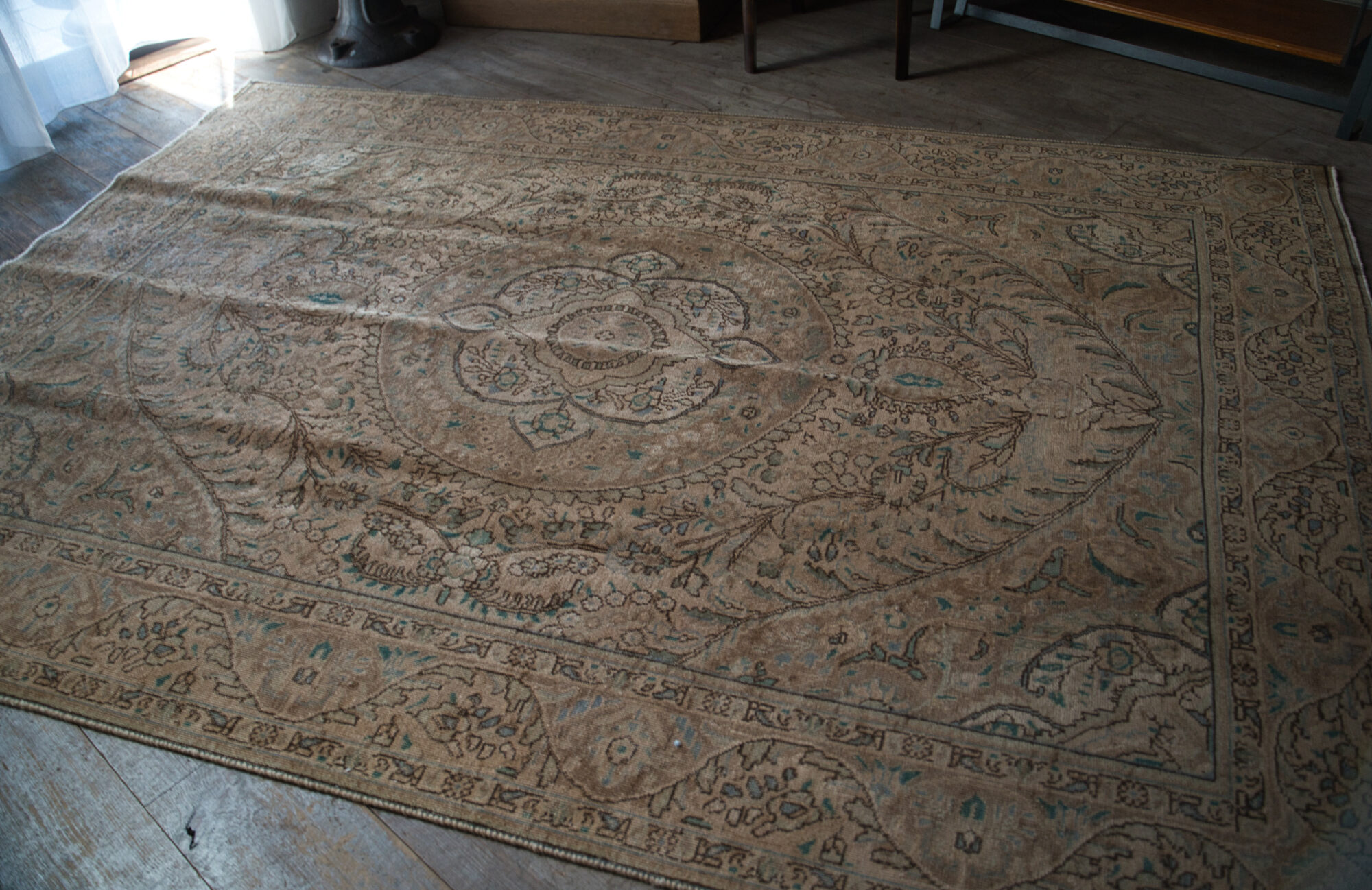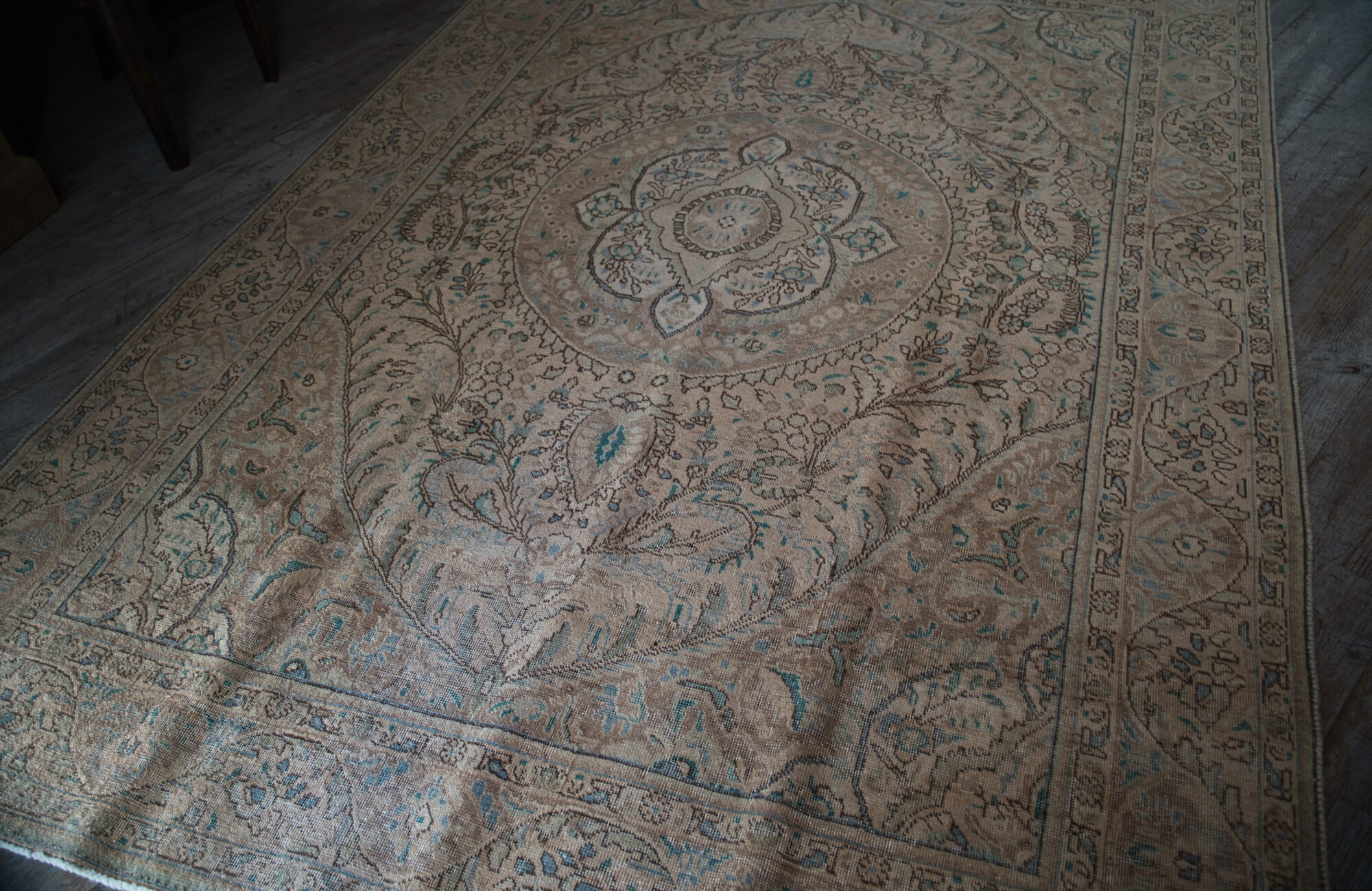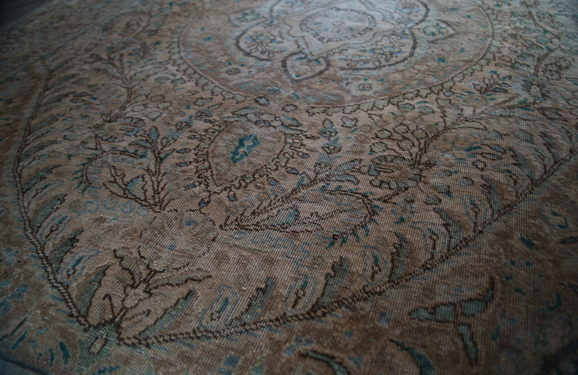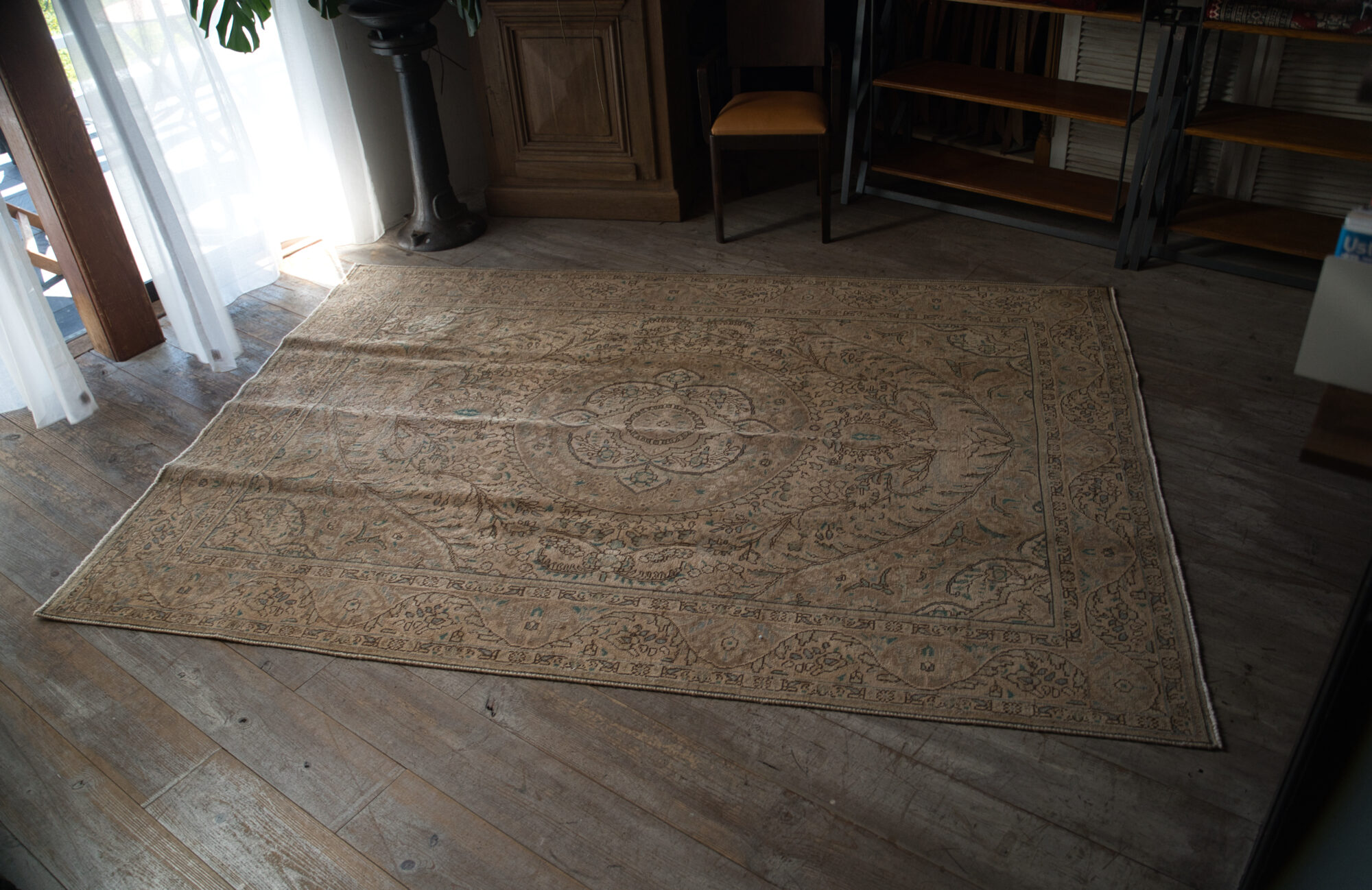 この絨毯は、5〜80年程経年の非常に年代物のアンティーク品に、ブリーチ、シャーリング(毛足カット)、天然染料による後染め加工を施して、伝統的な手織りペルシアンラグの良さを残しながら、新しい姿に再生させたものです。