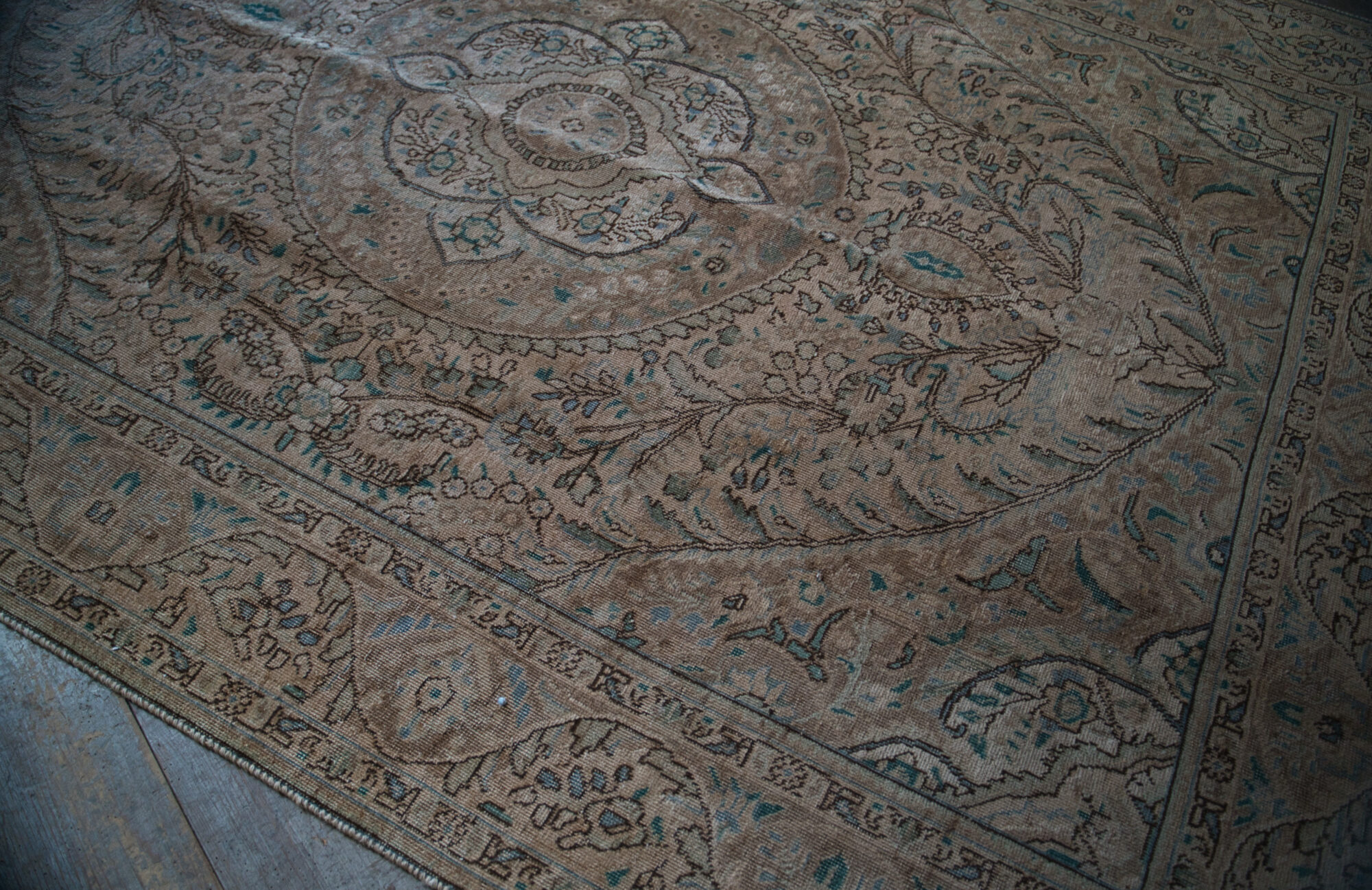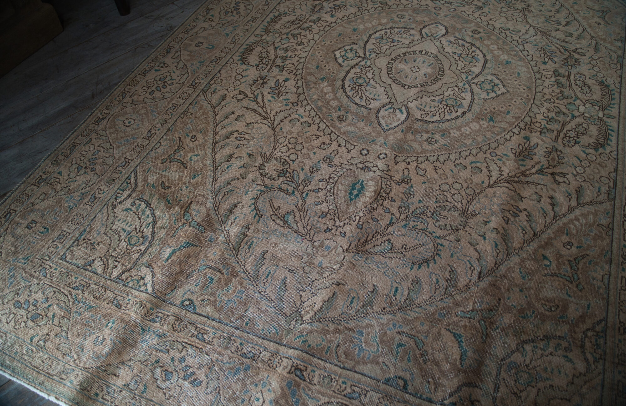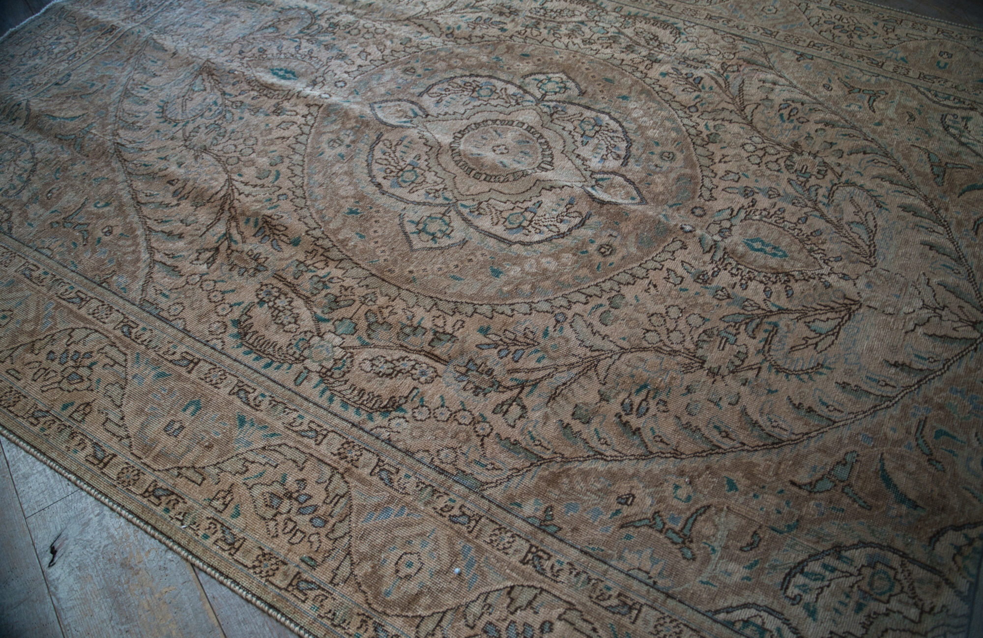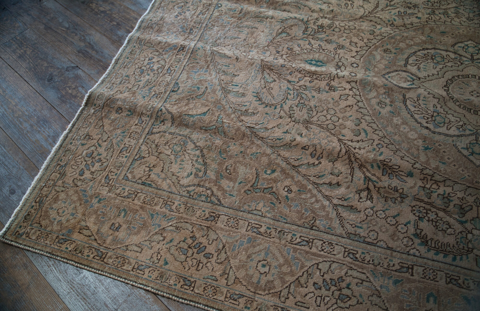 この絨毯は、5〜80年程経年の非常に年代物のアンティーク品に、ブリーチ、シャーリング(毛足カット)、天然染料による後染め加工を施して、伝統的な手織りペルシアンラグの良さを残しながら、新しい姿に再生させたものです。