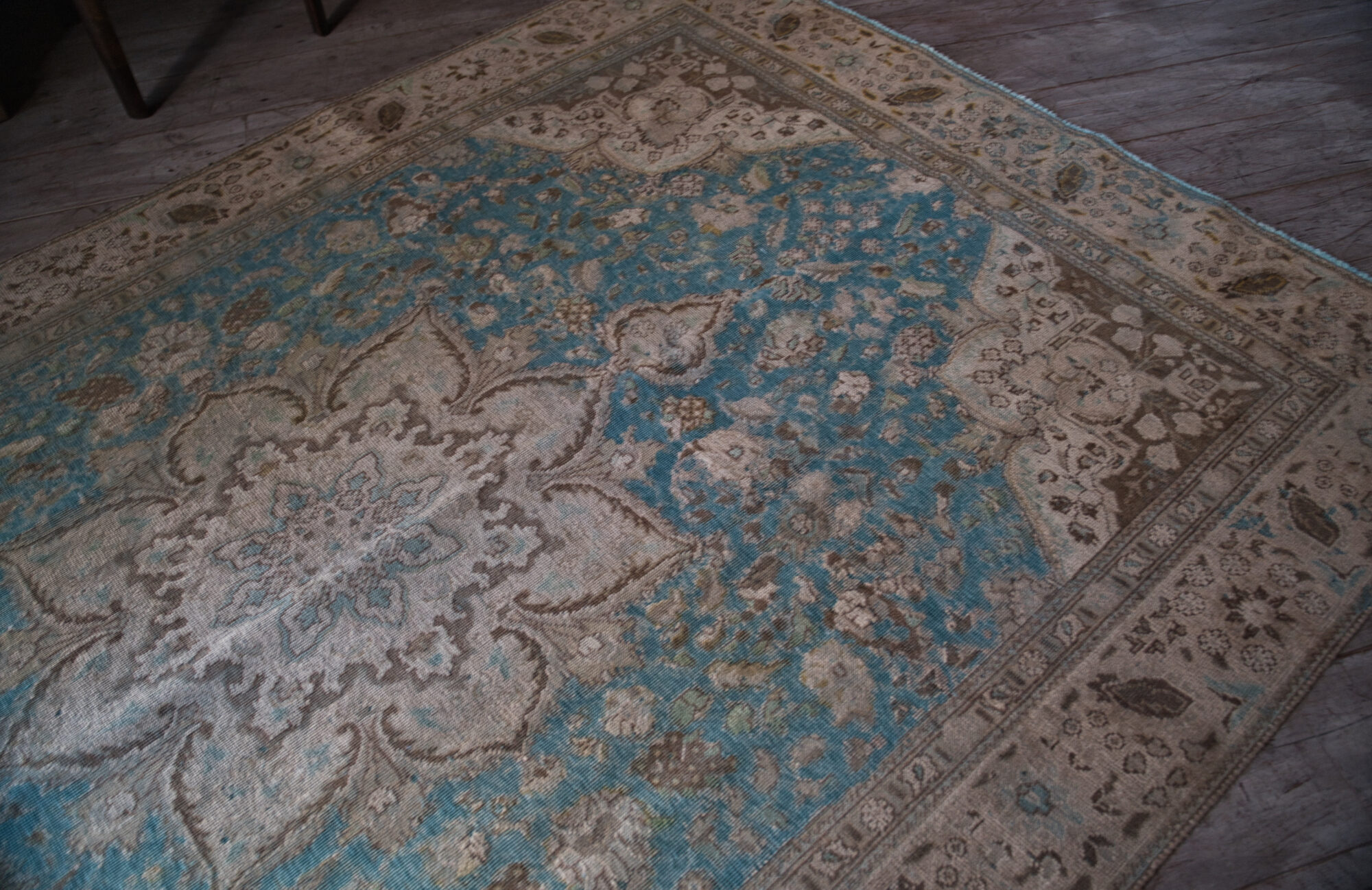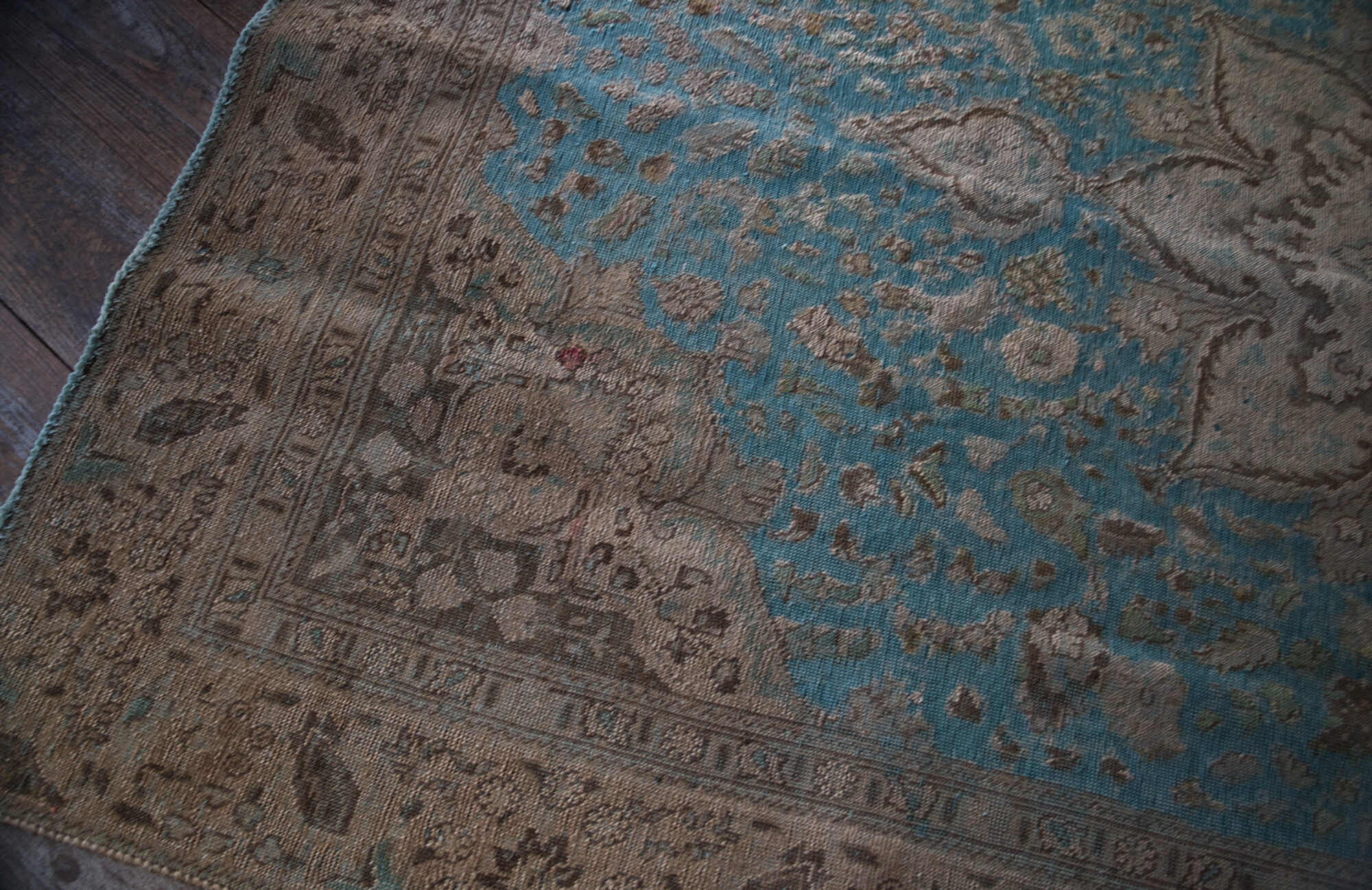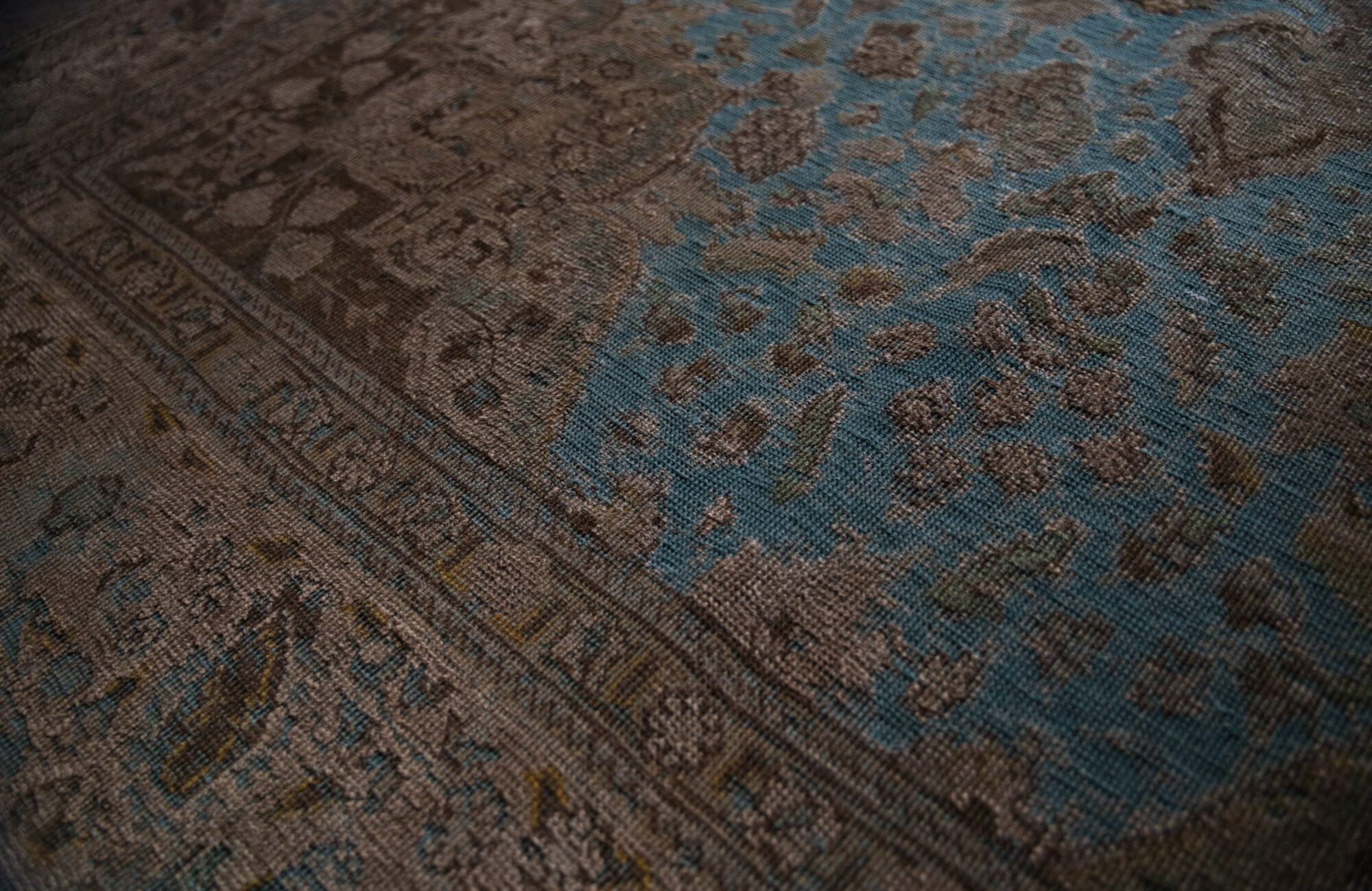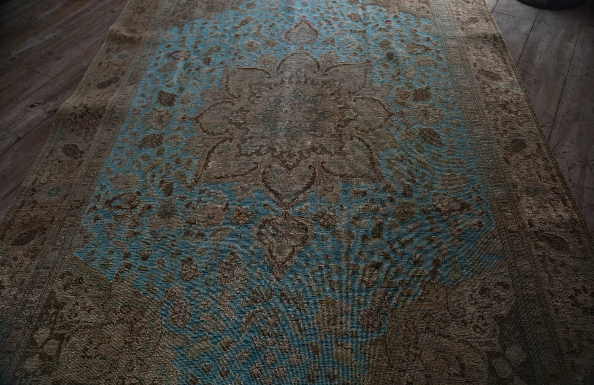 この絨毯は、5〜80年程経年の非常に年代物のアンティーク品に、ブリーチ、シャーリング(毛足カット)、天然染料による後染め加工を施して、伝統的な手織りペルシアンラグの良さを残しながら、新しい姿に再生させたものです。