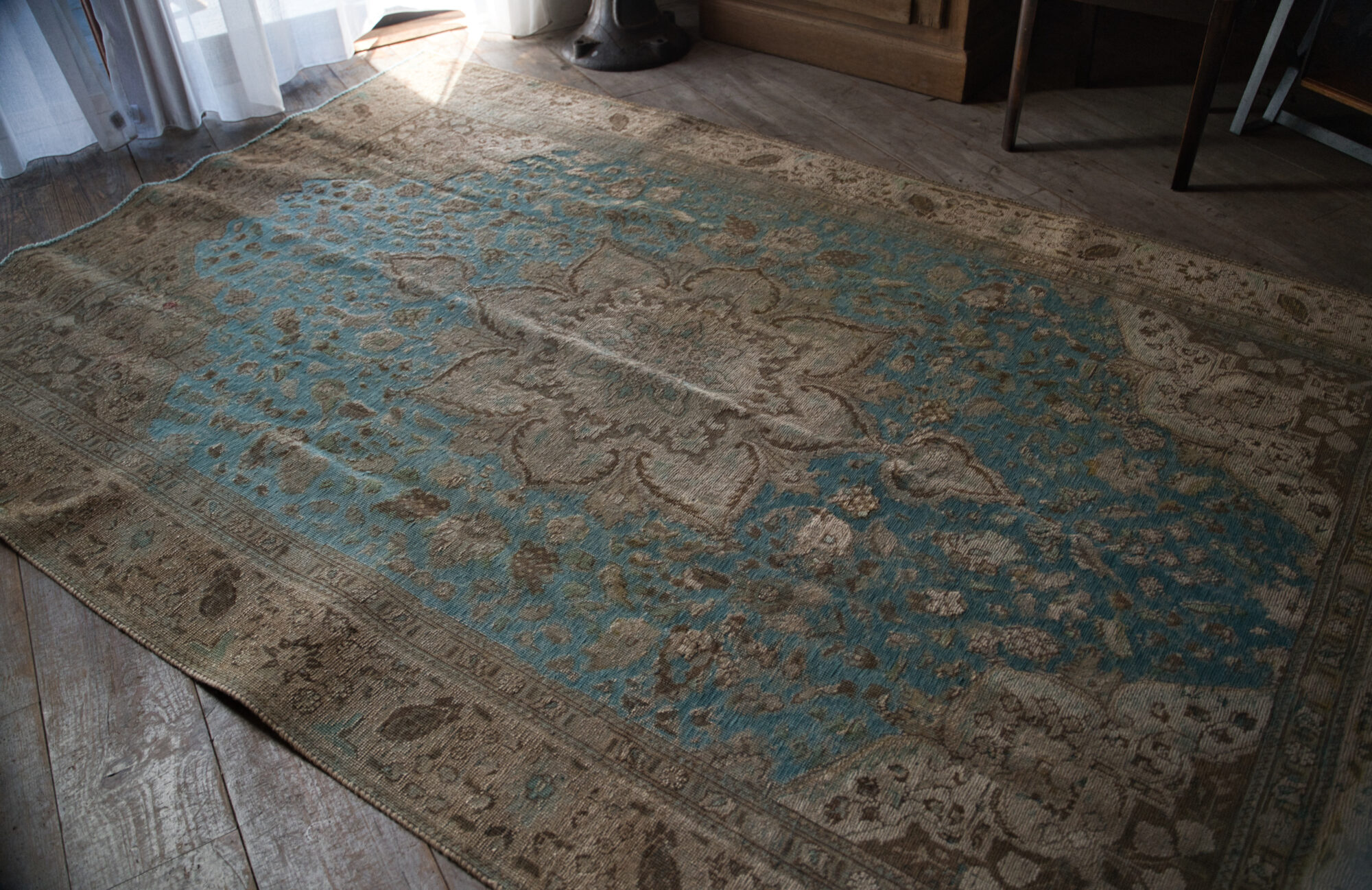 淡いターコイズ色のセンターメダリオンが少しづつ退色し、色のコントラストが全体的に落ち着いたベージュトーンになる経年変化も見てみたいオーバーダイです。