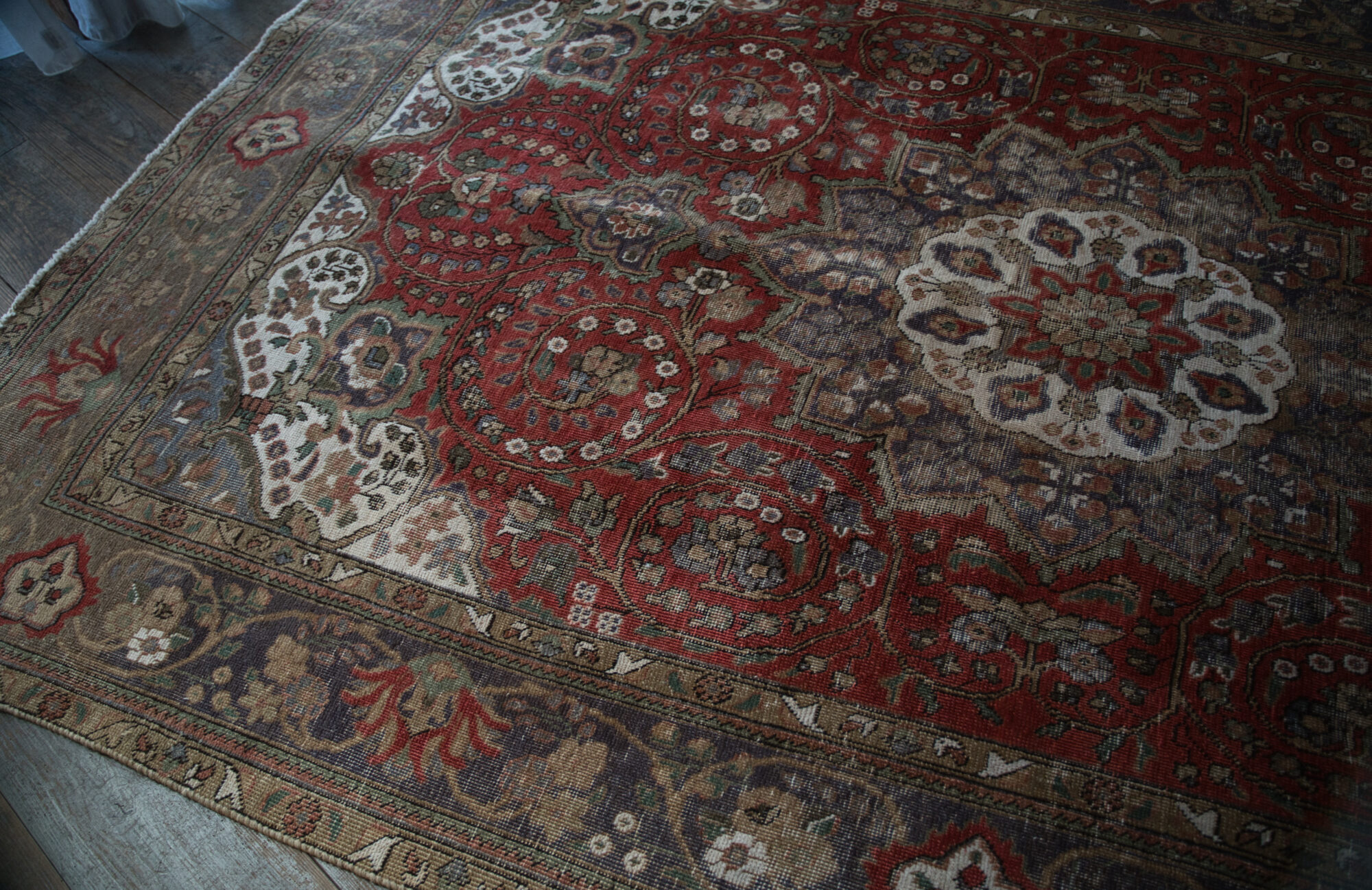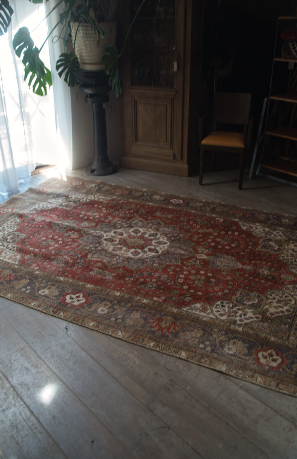 この絨毯は、5〜80年程経年の非常に年代物のアンティーク品に、ブリーチ、シャーリング(毛足カット)、天然染料による後染め加工を施して、伝統的な手織りペルシアンラグの良さを残しながら、新しい姿に再生させたものです。