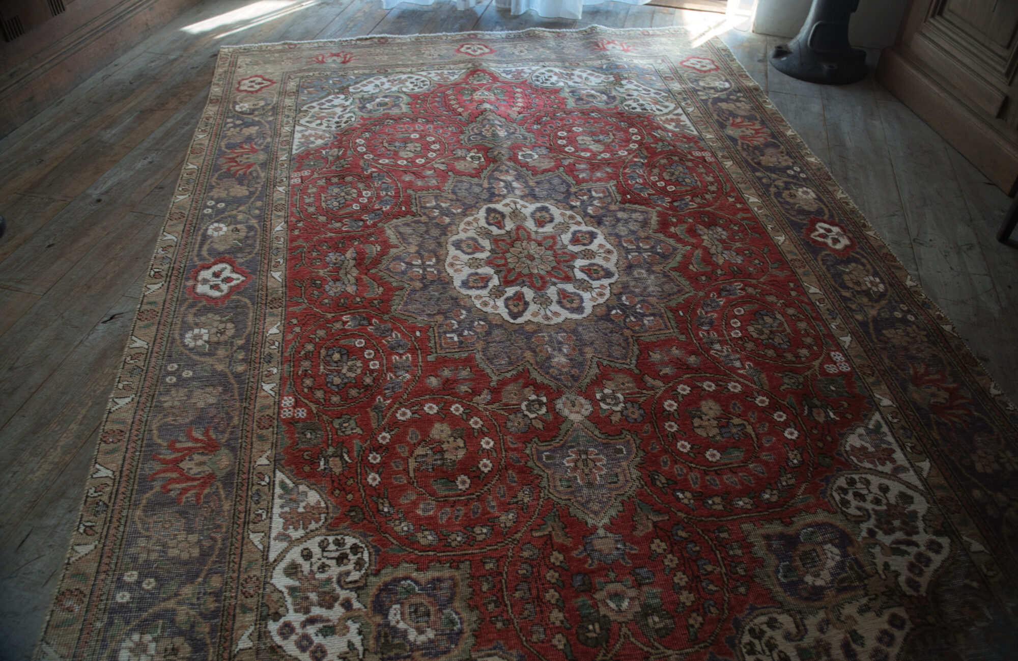 センターメダリオンや、フレームに控えめに配された渋みのある紫色が、この絨毯に落ち着いた鮮やかさを演出してくれています。