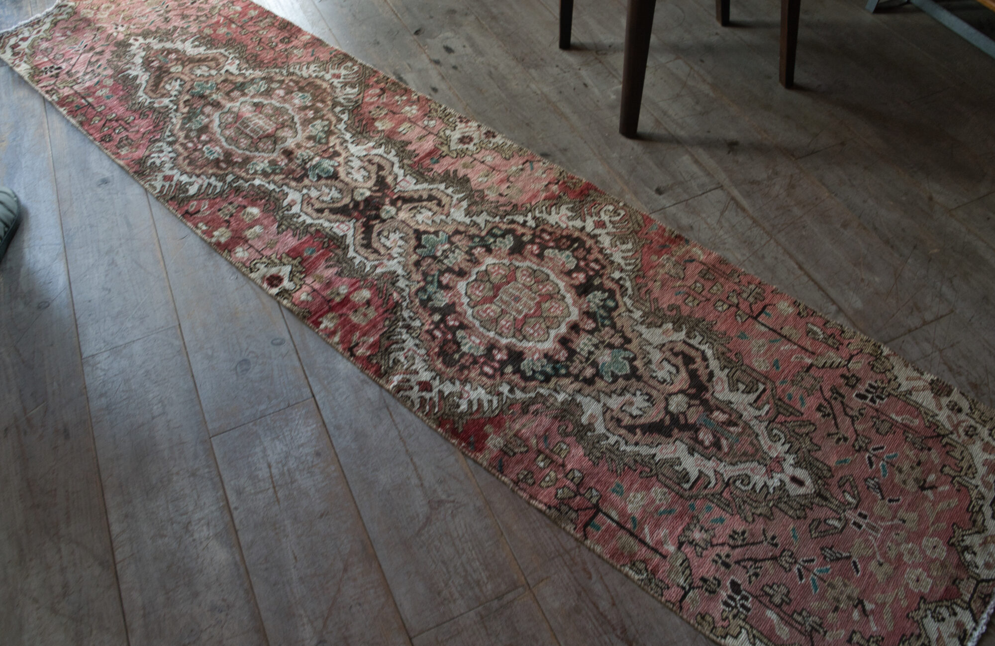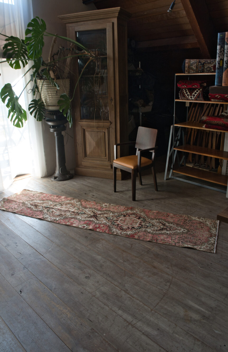 この絨毯は、5〜80年程経年の非常に年代物のアンティーク品に、ブリーチ、シャーリング(毛足カット)、天然染料による後染め加工を施して、伝統的な手織りペルシアンラグの良さを残しながら、新しい姿に再生させたものです。