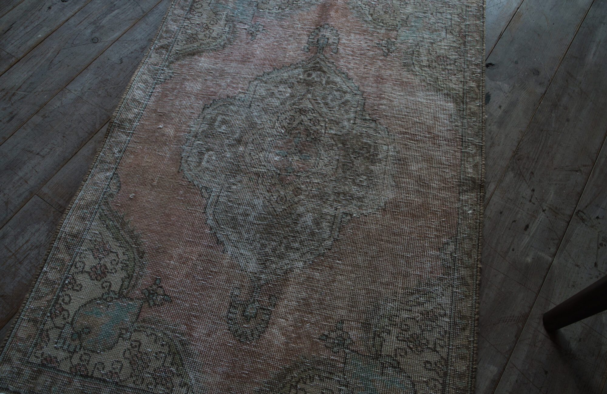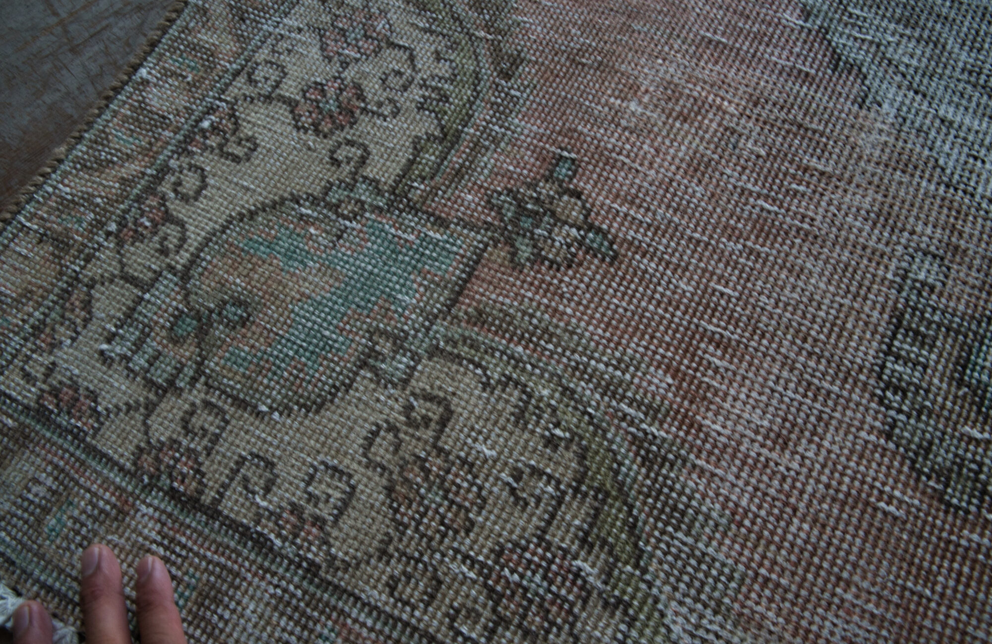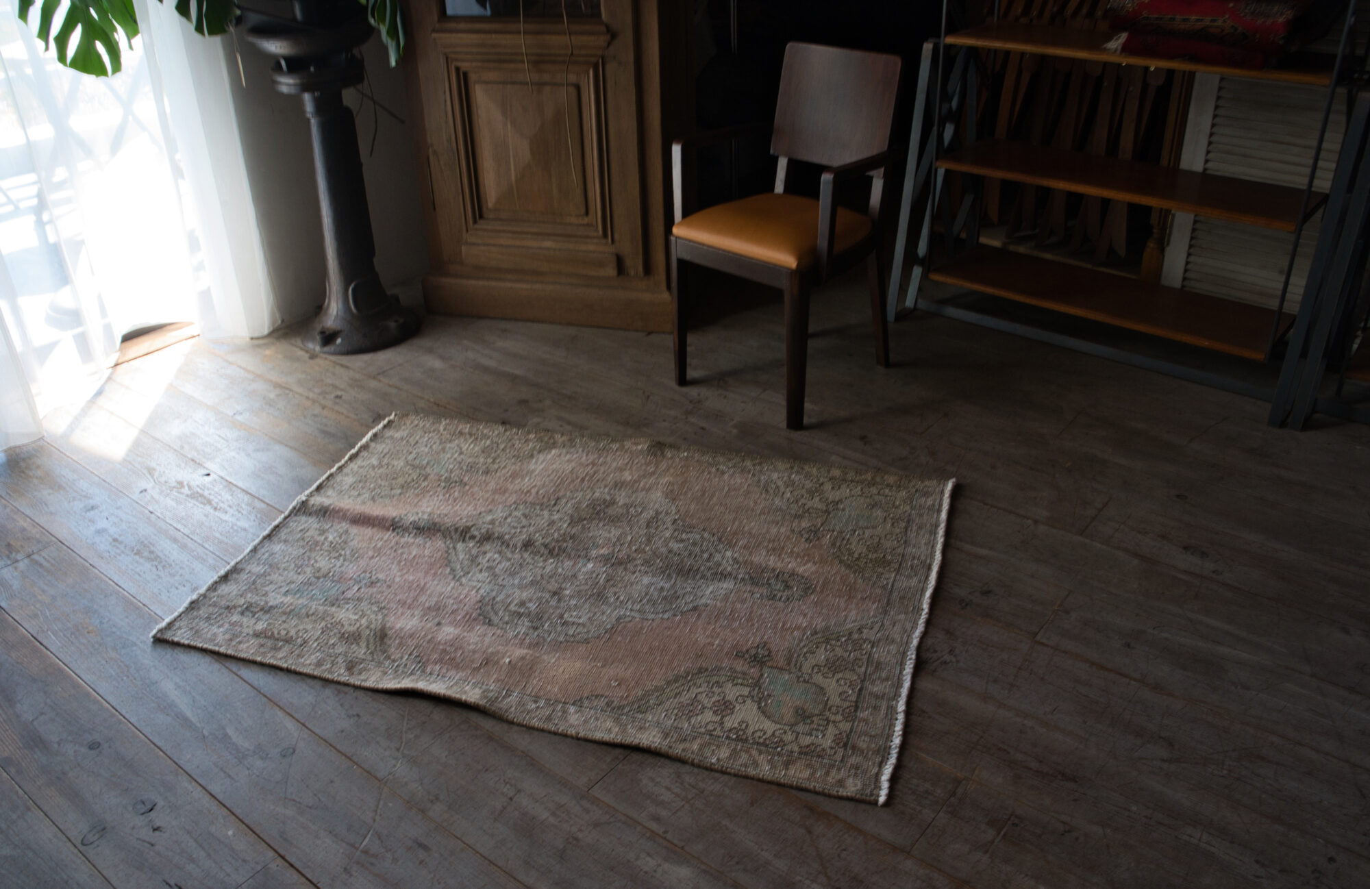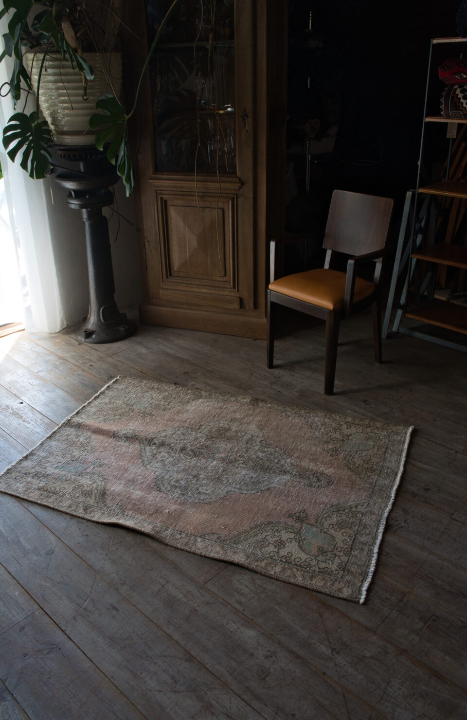 この絨毯は、5〜80年程経年の非常に年代物のアンティーク品に、ブリーチ、シャーリング(毛足カット)、天然染料による後染め加工を施して、伝統的な手織りペルシアンラグの良さを残しながら、新しい姿に再生させたものです。