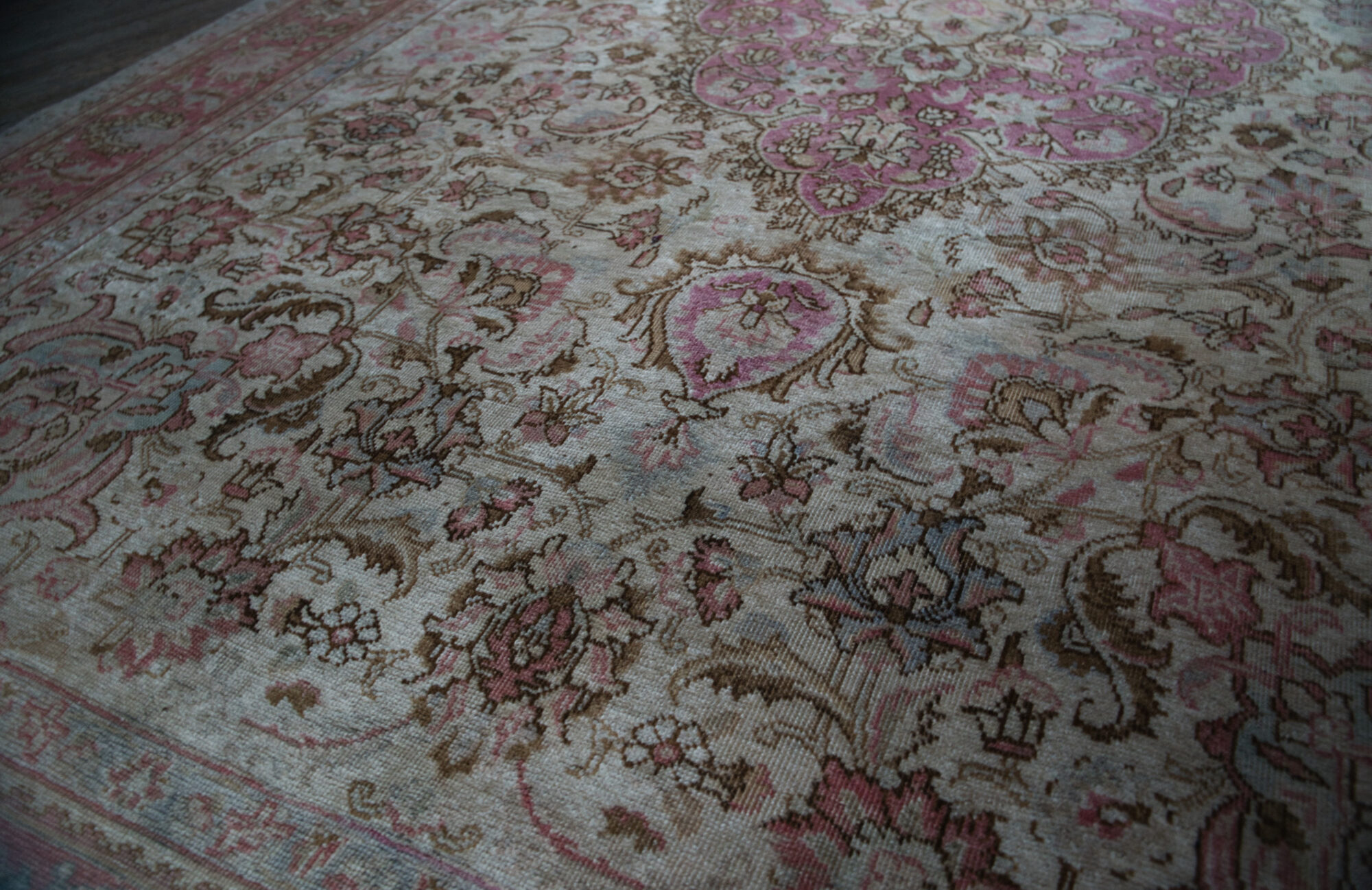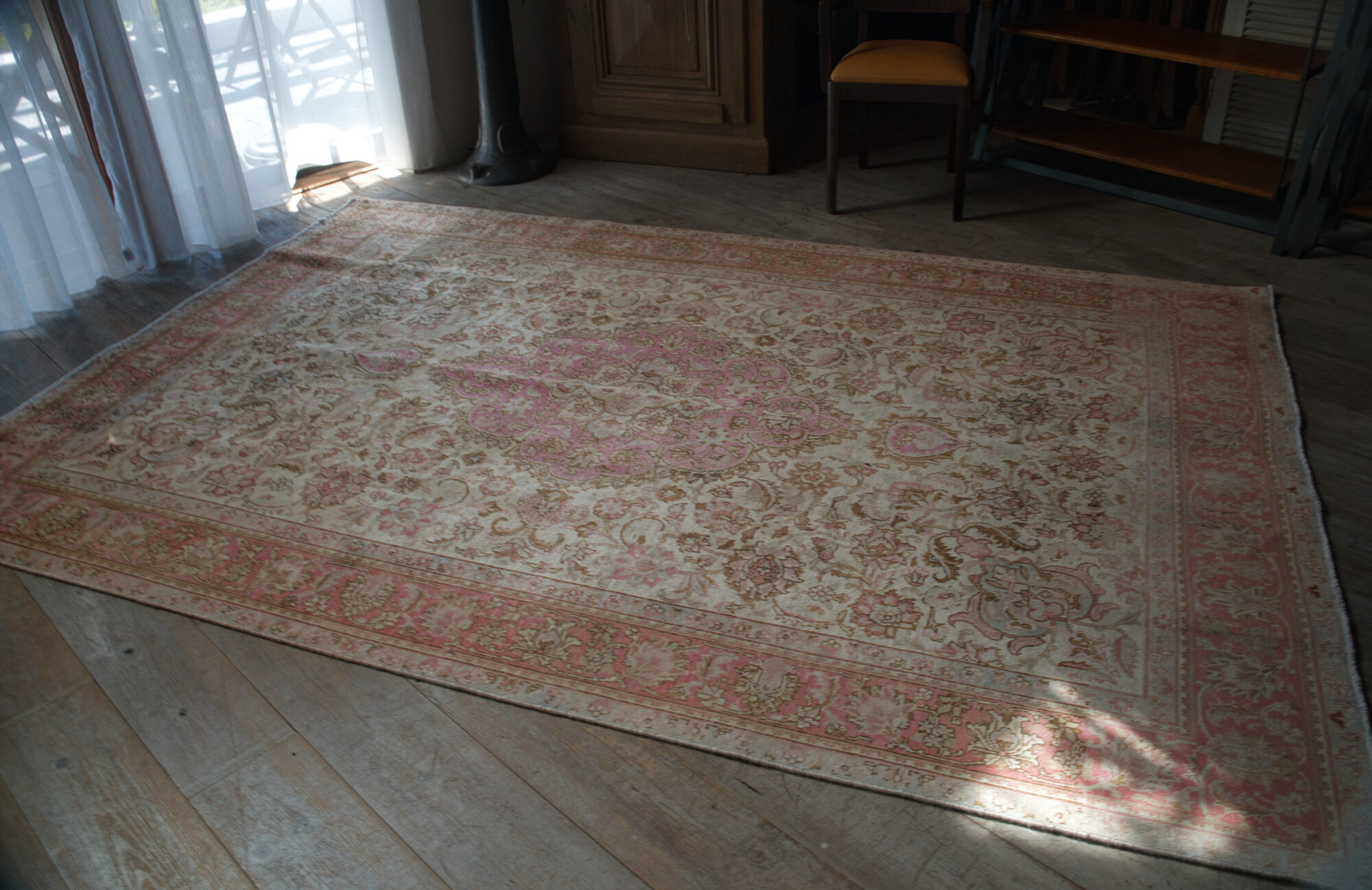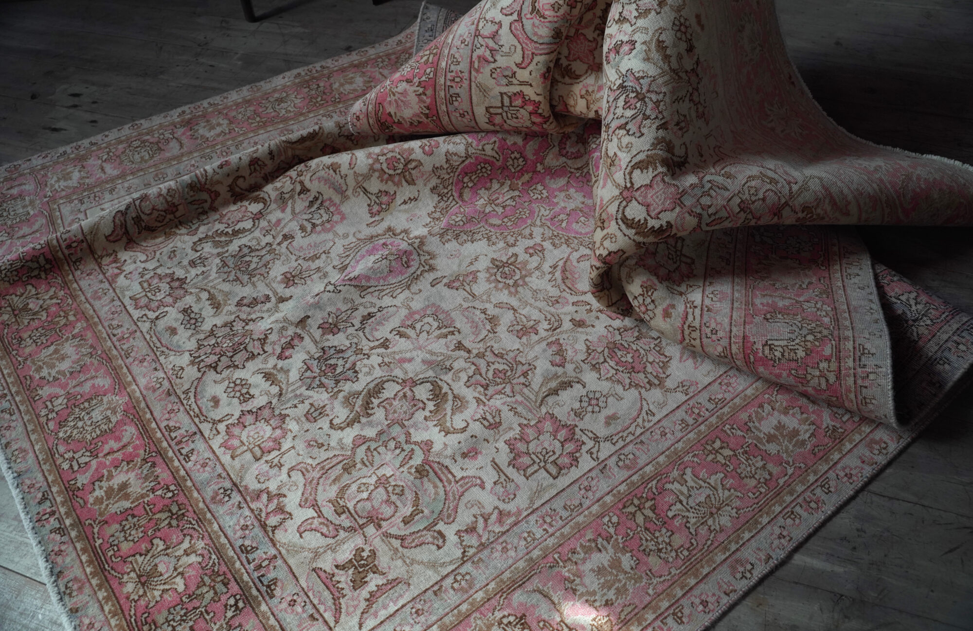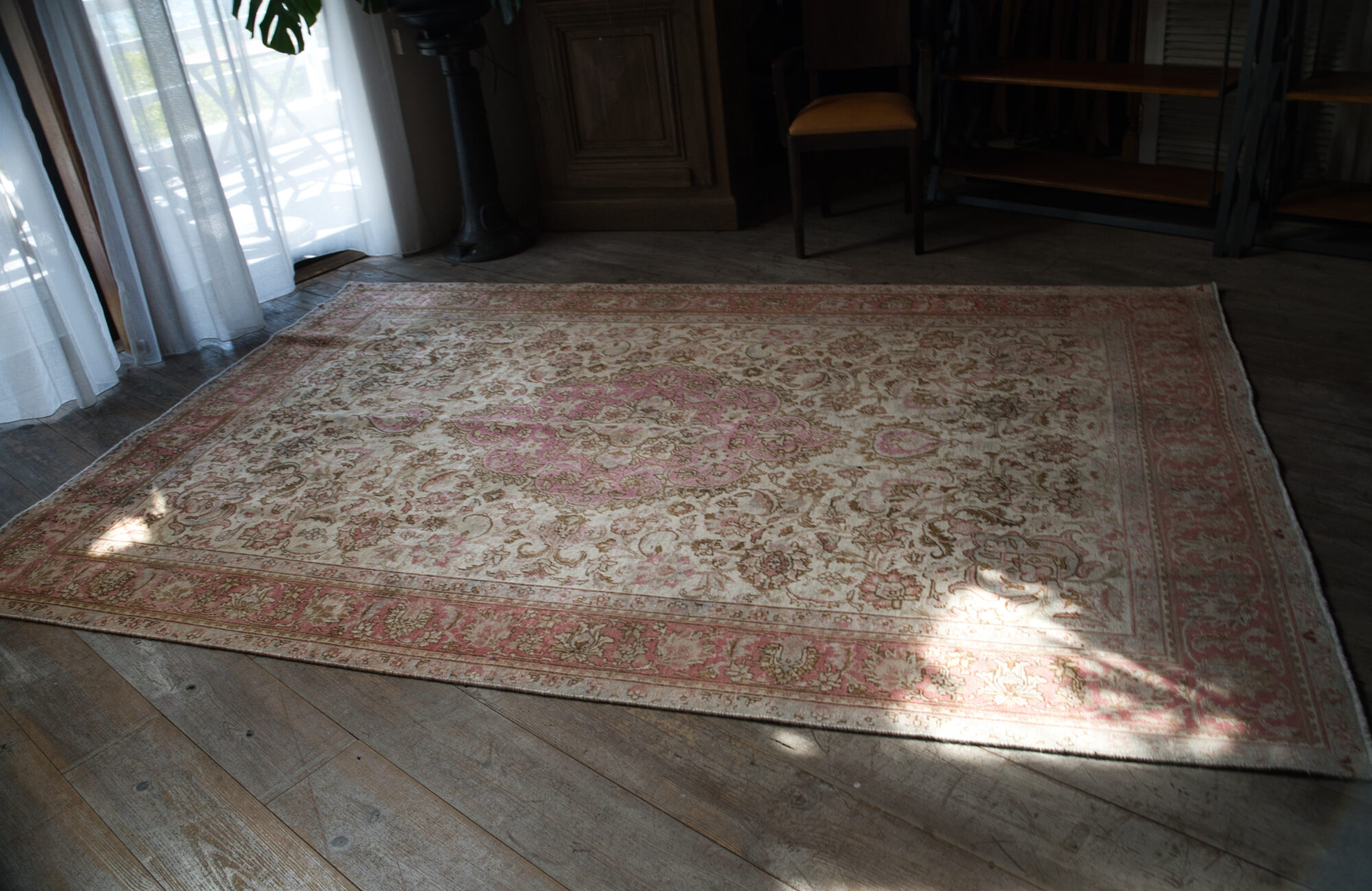 この絨毯は、5〜80年程経年の非常に年代物のアンティーク品に、ブリーチ、シャーリング(毛足カット)、天然染料による後染め加工を施して、伝統的な手織りペルシアンラグの良さを残しながら、新しい姿に再生させたものです。