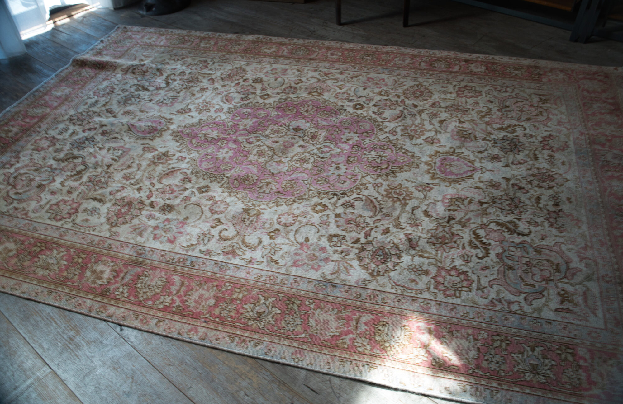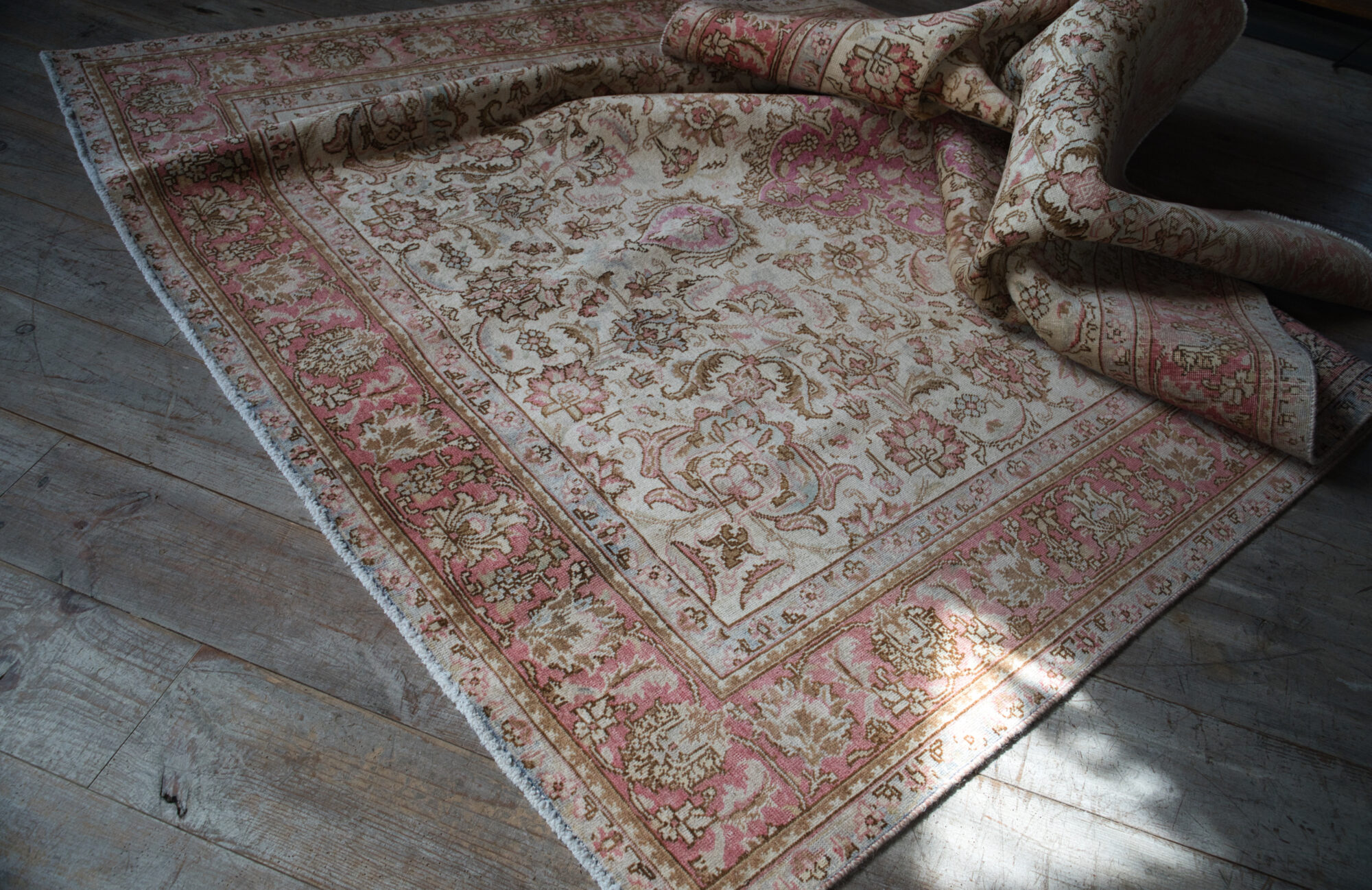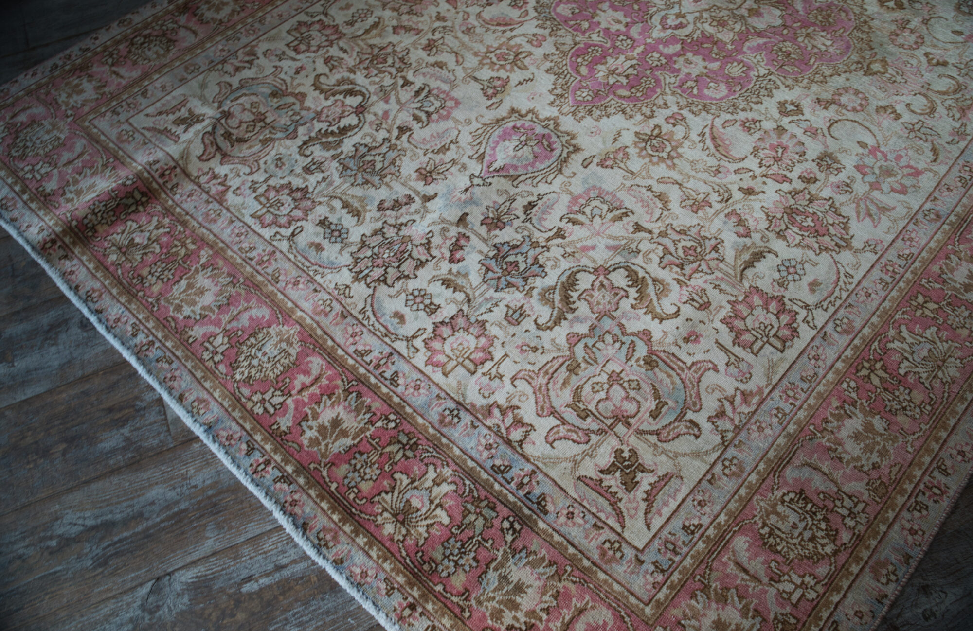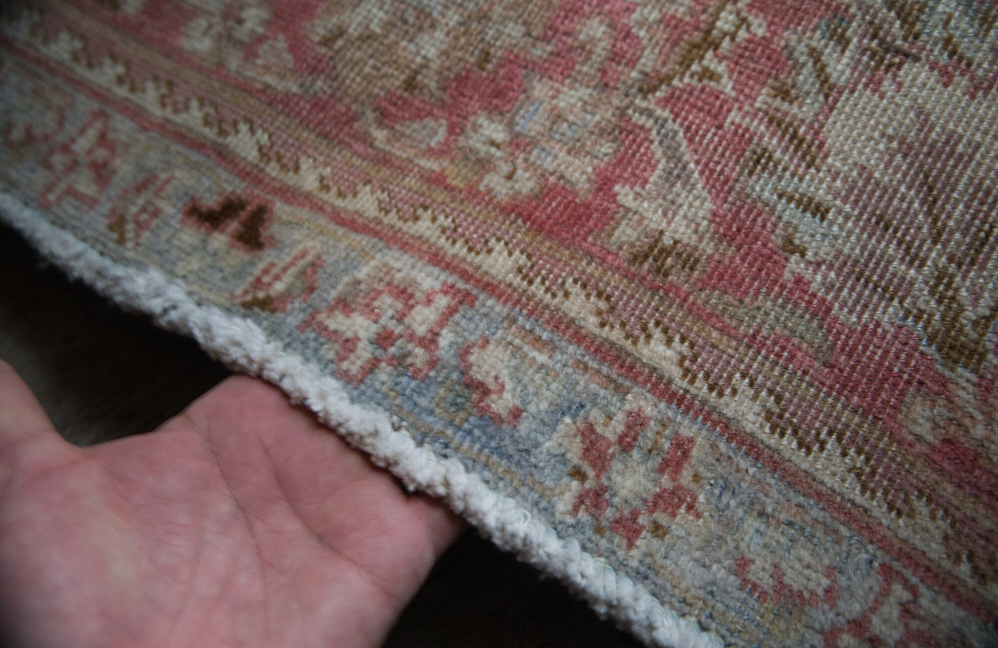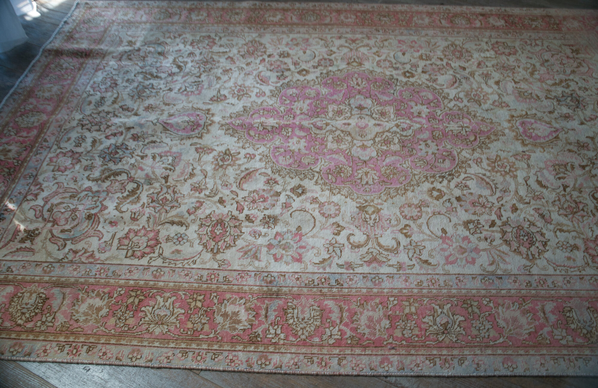 この絨毯は、5〜80年程経年の非常に年代物のアンティーク品に、ブリーチ、シャーリング(毛足カット)、天然染料による後染め加工を施して、伝統的な手織りペルシアンラグの良さを残しながら、新しい姿に再生させたものです。