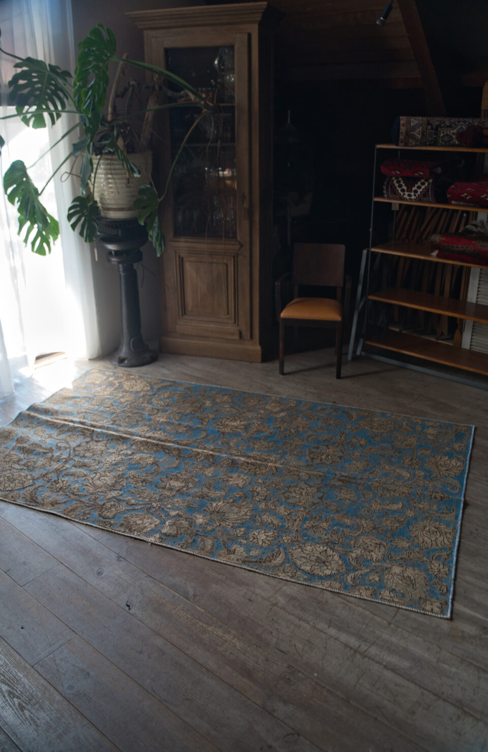 この絨毯は、5〜80年程経年の非常に年代物のアンティーク品に、ブリーチ、シャーリング(毛足カット)、天然染料による後染め加工を施して、伝統的な手織りペルシアンラグの良さを残しながら、新しい姿に再生させたものです。